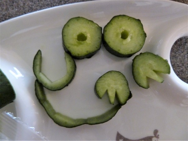 単純に輪切りにしたキュウリが、お箸で穴をあけて「目玉」、切り込みを入れて「手」になります。