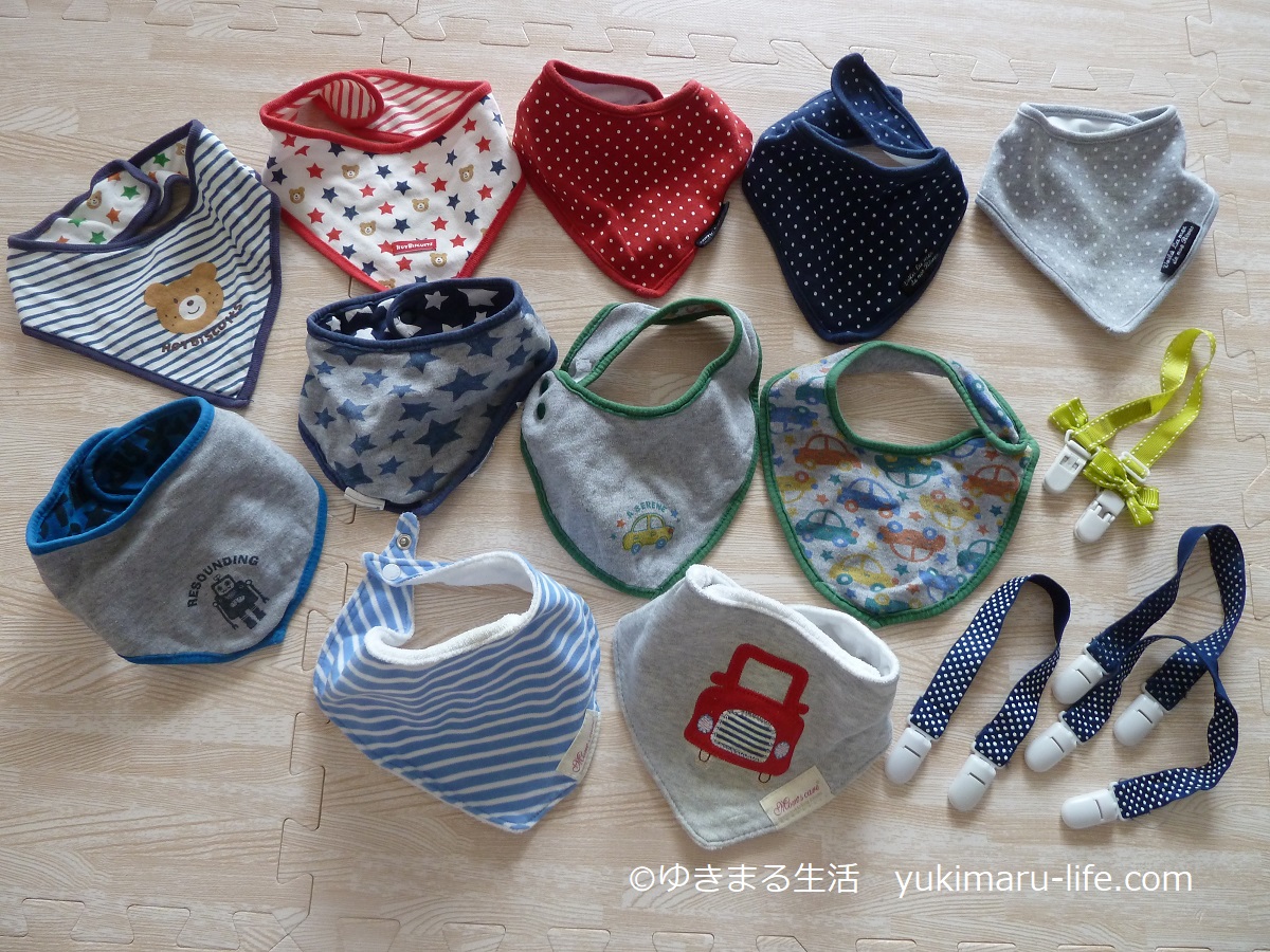 最後にお世話になったのは、バンダナふうスタイ。自宅ではお弁当用ナフキンを半分の三角形に折って、節約していました。ネット通販はもちろん、アカチャンホンポ等でも、安く売っています。